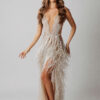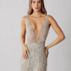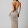 Vestido longo confeccionado em tule ilusion, inteiramente bordado com franjas de vidrilho na cor prata