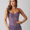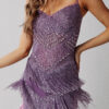 Vestido longo com parte superior alongada, estrutura com barbatanas e bordados em vidrilhos e gotas na cor roxa. Saia com fenda lateral e camadas de franjas de vidrilhos.