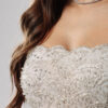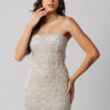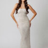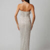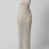 Vestido longo tomara que caia em filtro texturizado na cor off white e bordados cravejados na cor prata.